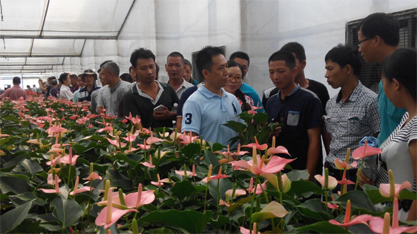 9月9日,广东省鹤山市花木盆景协会吴细强会长一行30余人到名卉从化基地参观交流。在名卉公司曾日卿副总经理陪同下,一行人参观了高档盆花生产大棚。吴细强会长对从化基地花卉生产品质、机械化生产模式给予高度评价,并将加强双方在花卉生产上的交流与合作,力求实现共赢。