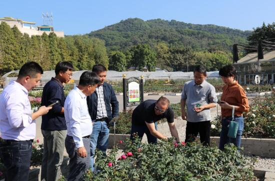 玫昂国际月季公司一行实地考察了我院月季品种资源收集圃,在考察现场,梅兰德先生详细解了广州气温、降水量等信息,仔细查看了种植土壤与现植月季的生长情况,就月季品种筛选、繁育、推广应用等方面提出专业指导意见。
