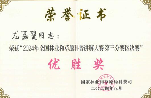 2024年8月9日,2024年全国林业和草原科普讲解大赛第三分赛区决赛(以下简称“大赛”)在广东科学馆举行。经过激烈的角逐,市园科院龙嘉翼同志从42名参赛选手中脱颖而出,获得大赛“第三分赛区决赛优胜选手奖”并被推荐参加全国总决赛。