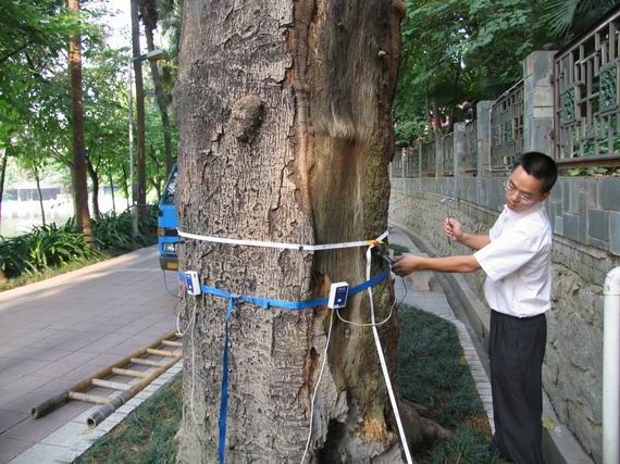 应越秀公园的邀请,在公园副主任钟丰的陪同下,广州市园林科学研究所朱纯副所长带领相关科技人员利用“树木断层分析仪”,于2006年11月13日对位于该公园内的凤凰木和大叶榕二株大树的健康状况进行了全面体检。该二株大树位于公园游人较多的景点,加之遭受白蚁与蛀干性害虫的侵害,部分主干已中空腐烂,危险性极高,通过此次检测分析,发现存在问题,并提出了可行的抢救方案与措施,极大限度地减少了安全隐患,有效地预防了安全事故的发生。