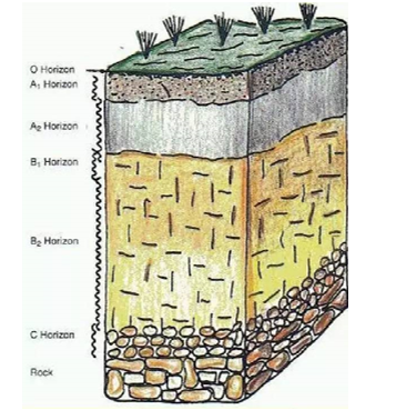 自然土壤剖面:1967年国际土壤学会提出把土壤剖面分为:O层(有机层)、A层(腐殖质层)、E层(淋溶层)、B层(淀积层)、C层(母质层)和R层(基岩)等6个主要土层。