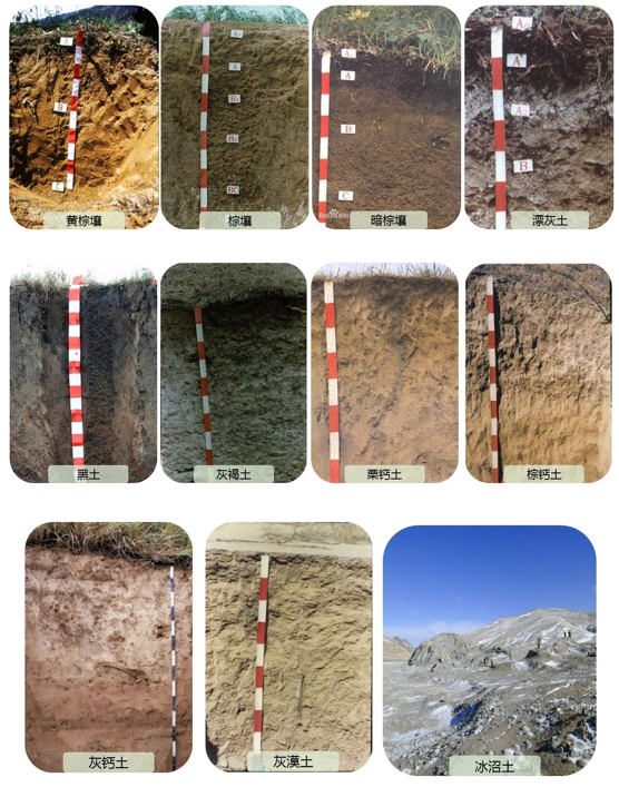 中国土壤类型分布:在我国东部,形成湿润海洋土壤地带谱,由南而北依次分布着:砖红壤→赤红壤→红壤、黄壤→黄棕壤→棕壤→暗棕壤→漂灰土;在我国西部形成干旱内陆性土壤地带谱,由东向西分布着:黑土→灰褐土→栗钙土→棕钙土→灰钙土→灰漠土。