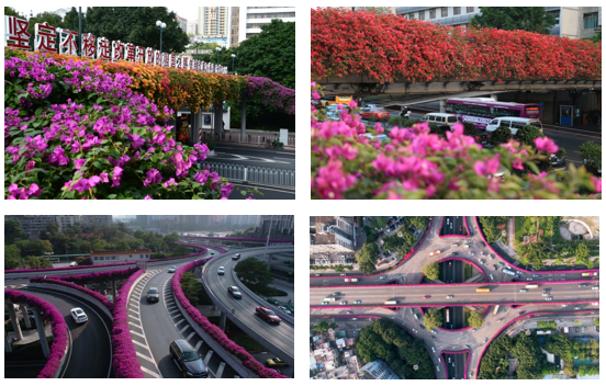 没错,这是我们在广州市天桥上最常见到的植物品种,三角梅,又称簕杜鹃,叶子花,或者九重葛。现在已大量运用于广州市天桥绿化,而且景观与生态效果都很显著。话不多说,美图献上: