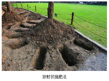 (2)放射状施肥法:以植物为中心向植物外緣顺着水平根系的生长方式挖沟,由浅而深。每株植物挖5~6条均匀分布在投影圈内的放射状沟,将肥料均匀施入沟内,结合灌水将肥料施于灌水堰内,随水渗入,供树根吸收利用,覆土填平。此法有点是伤根少,植物根系吸收养分较多。