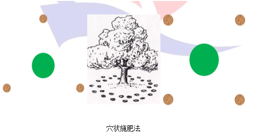 (3)穴状施肥法:在植物投影圈内按一定距离挖穴,穴的数量依植物冠幅大小而定,近外緣多些,近植物主干少些。穴的大下常为30cm左右,肥料施入穴内,覆土填平。此法简单、伤根少、根系吸收面积大。
