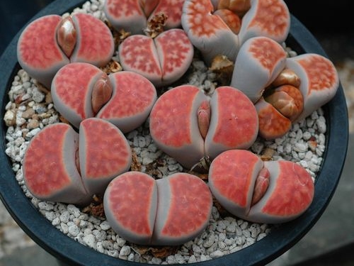 生石花生活在非洲南部的沙漠地区,它的颜色、形状与卵石惟妙惟肖,叶肥厚多汁,裹成卵石状,能贮存水分。生石花开金黄色的花,非常好看,而且一株只开一朵花,不过只开一天就凋谢。生石花生成这个样子,当然是为了鱼目混珠,蒙骗动物,避免被吃掉。生石花喜欢与沙砾乱石为伴, 要是离开了这种环境就很难活命。