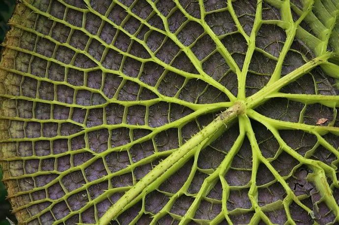 王莲具有世界上水生植物中最大的叶片,直径可达3米以上,叶面光滑,叶缘上卷,犹如一只只浮在水面上的翠绿色大玉盘。它的叶片具有非常大的浮力,最多可承受六七十千克重的物体而不下沉。水生植物内一般含有大量水,因此格外脆嫩,然而王莲同样整日泡在水中,它又是如何坚挺承重的呢?秘密就藏在王莲叶片的背后,它有8条巨大的主叶脉,如钢梁般从中心辐射到边缘。相邻两条主脉之间还有许多垂直生长的支脉,将整张叶片切割成纵横交错的网格。不仅如此,王莲的叶片和叶脉内还具有很多大的空腔,腔内充满气体也进一步增加了叶片的浮力。
