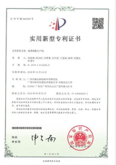 近年来,华南农业大学、广州市林业和园林科学研究院、广州市绿风生物技术有限公司联合开展了广东省科技计划项目“药用植物固体废渣的生物药肥研制与推广应用”,依托该项目的研究成果,三家单位联合申请的实用新型专利“基质混配生产线”于2019年9月20日正式授权。