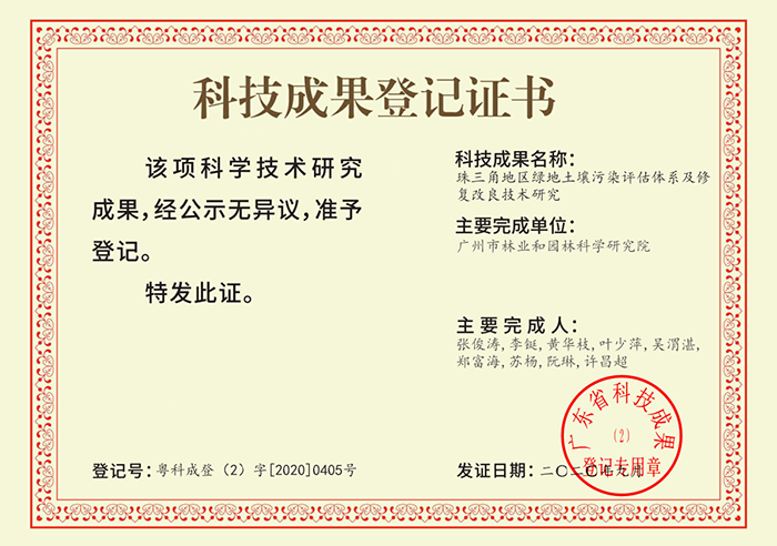 2020年9-10月,由我院自主实施完成的广东省科技计划项目“珠三角地区绿地土壤污染评估体系及修复改良技术研究”及广州市部门预算项目“广州市园林种植土修复改良关键技术研究”陆续获得广东省科技成果登记证书。