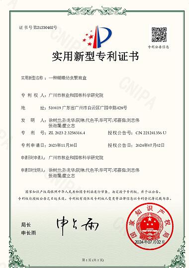 近日,植物保护研究所申报的观赏蝴蝶饲养装置《一种蝴蝶幼虫繁育盒》获得国家实用新型专利授权,专利号为:ZL 202323258316.4。