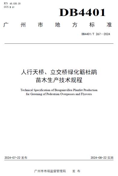 7月16日,广州市市场监督管理局发布广州市地方标准通告【2024】12号(总第95号),批准发布市园科院制定的《人行天桥、立交桥绿化簕杜鹃苗木生产技术规程》等8项广州市地方标准。