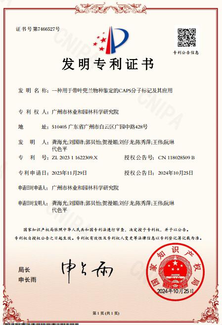 近日,市园科院申报的用于鉴定带叶兜兰(Paphiopedilum hirsutissimum)的分子标记及其使用方法《一种用于带叶兜兰物种鉴定的CAPS分子标记及其应用》获得国家发明专利授权,专利号为:ZL 2023 1 1622309.X。