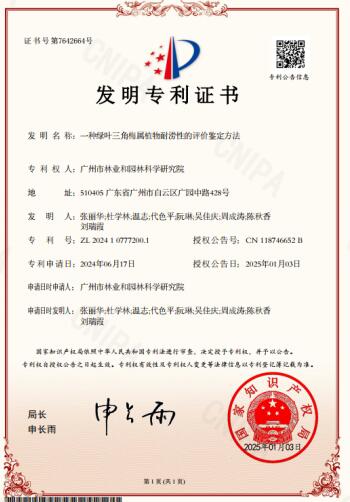 近日,市园科院白云苗圃申报的《一种绿叶三角梅属植物耐涝性的评价鉴定方法》(专利号:ZL 2024 1 0777200.1)获得国家发明专利授权。