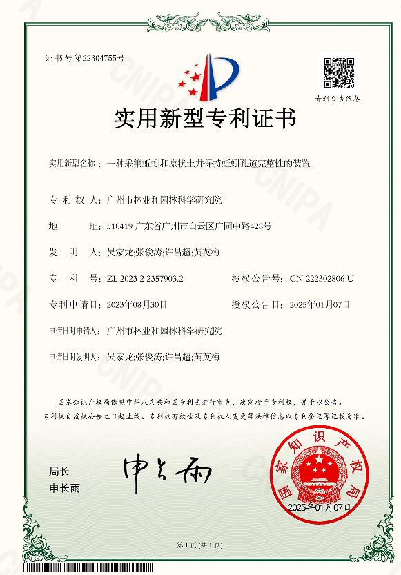 1月7日,市园科院土壤环境研究所申报的实用新型专利《一种采集蚯蚓和原状土并保持蚯蚓孔道完整性的装置》(专利号:ZL 2023 2 2357903.2),获国家知识产权局专利授权。