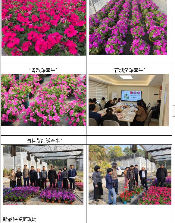 2025年1月21日,广东省农作物品种审定委员会办公室组织专家对我院选育的‘粤玫矮牵牛’、‘花城紫矮牵牛’和‘园科紫红矮牵牛’3个品种进行了现场鉴定。经实地查看申报品种、杂交亲本及对照品种形态特征,听取3个品种选育报告,审阅有关资料,答疑和充分讨论,专家组一致同意3个品种通过现场鉴定。