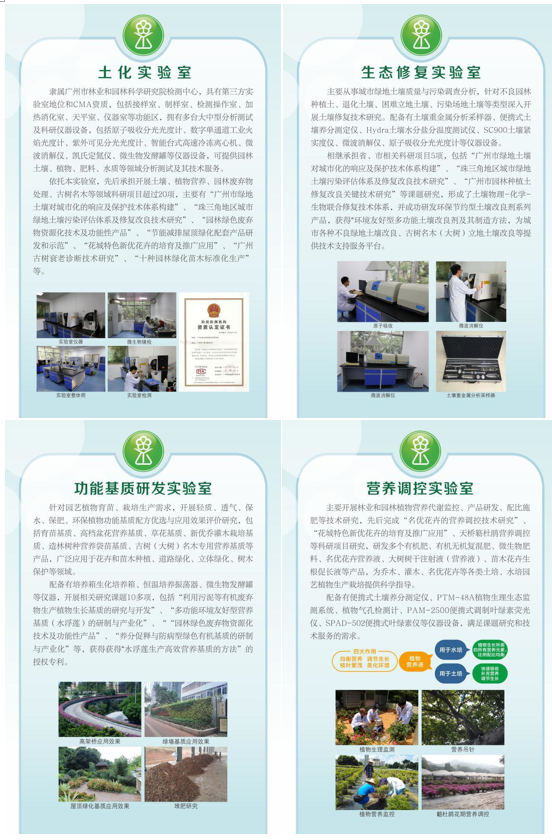 主要从事城市绿地土壤质量调查、评价与修复改良,园林植物营养诊断与配方施肥,古树名木健康巡查、衰弱诊断与抢救复壮,园林绿色废弃物资源化利用,屋顶绿化配套产品、土壤改良剂、栽培基质、促根液、肥料、营养液、微生物菌剂等产品研发与推广应用,并具备土壤、肥料、植物、水质样品的分析检测能力,拥有CMA资质证书,是集科研、产品开发利用、检测及技术服务于一体的综合性研究所。