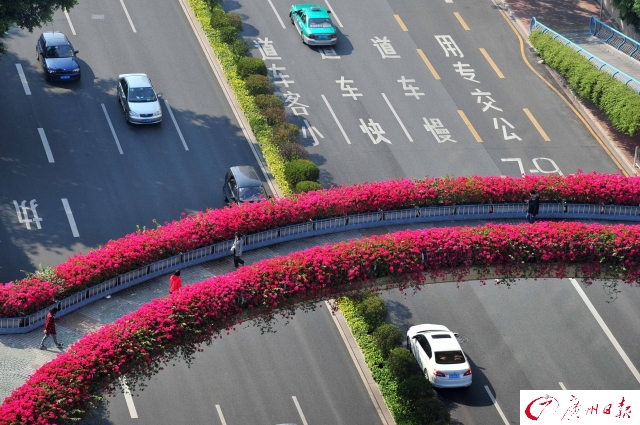 记者了解到,目前景观效果较好的天桥有:种植水红簕杜鹃的东风路陵园东西两侧人行天桥、执信南人行天桥、华泰宾馆人行天桥、盘福路立交桥;种植柠檬黄簕杜鹃的湖天宾馆人行天桥;种植紫花簕杜鹃的新滘西路果树公园人行天桥、逸景路人行天桥、上冲南人行天桥、南洲北路人行天桥、陈李济人行天桥、金穗路口人行天桥;配植樱花簕杜鹃+红花簕杜鹃的云台花园人行天桥。文/广报记者 全杰 通讯员 穗林园宣