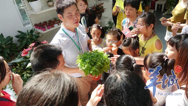 14个亲子家庭跟着王玮在白云区的艺家园林超市中导赏,兴致勃勃地边走边看边问,王玮也在导赏过程中透露了许多养植物的小诀窍。