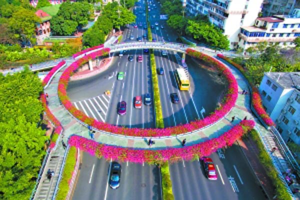 2017春节期间,广州市中心区10多座人行天桥立交桥上的簕杜鹃齐开放,与各色年花斗丽争妍,这是自2003年天桥绿化建设以来,簕杜鹃首次在1月开花。种植水红簕杜鹃的东风路陵园东西两侧人行天桥、执信南人行天桥、华泰宾馆人行天桥、盘福路立交桥;种植柠檬黄簕杜鹃的湖天宾馆人行天桥;种植紫花簕杜鹃的新滘西路果树公园人行天桥、逸景路人行天桥、上冲南人行天桥、南洲北路人行天桥、陈李济人行天桥、金穗路口人行天桥;配植樱花簕杜鹃+红花簕杜鹃的云台花园人行天桥,都已经成为广州的新“名桥”。