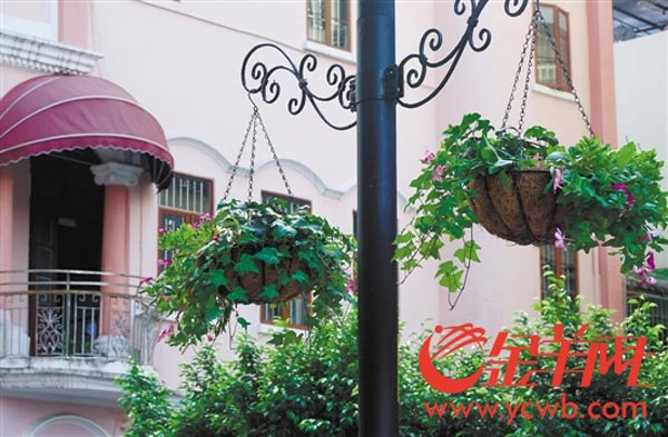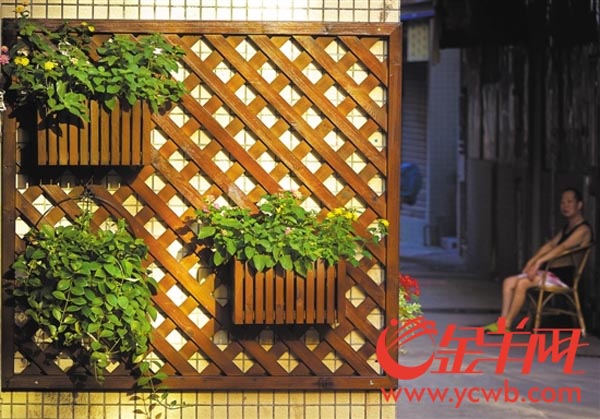 原本冷冰冰的水泥地板和瓷砖墙壁,有了鲜花绿植的装点,变得小清新起来了。数百米长的厂后街隔几十米便有高高的陶土花钵,墙面上还有木架子及错落固定的盆栽,灯柱上也挂上了花篮,就连街坊门口也被装点成颇具风情的绿色角落。