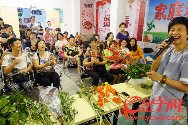 在插花技巧知识讲座上,由广州插花艺术研究会的花艺大师向居民群众讲解传授插花技巧知识,有23年插花经验的张老师向街坊讲述了近现代花艺的发展历程,向居民介绍了中式、西式和日式等不同花艺流派知识。张老师教导街坊用茶花叶遮挡花泥,随后再插上茶花枝,几株颜色艳丽的红豆花,两株含苞待放的百合,短短几分钟,一盆颇具岭南风情的插花盆景便出现在大家的面前,看着不同花卉搭配出现的美感,居民群众纷纷向张老师请教,希望届时自己动手给家里也来个绿化改造。