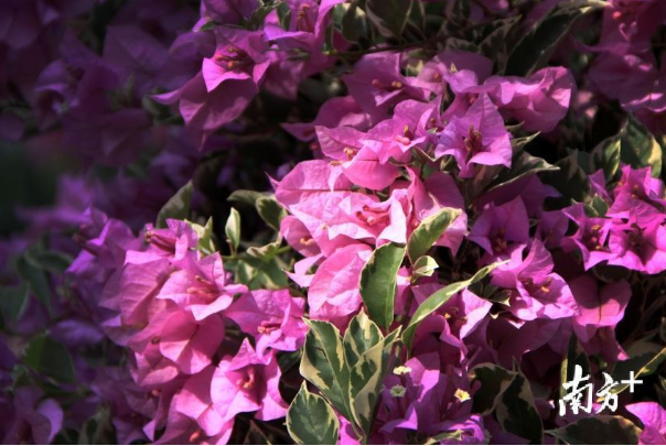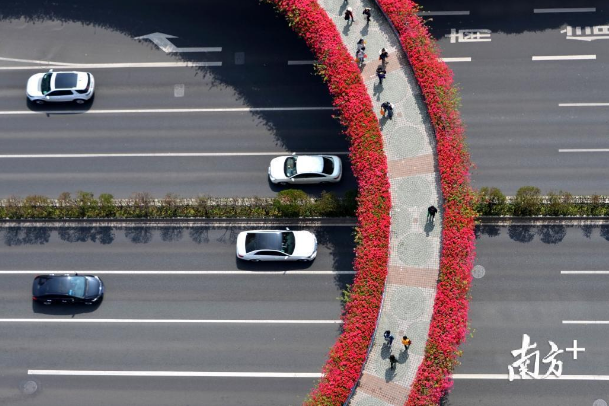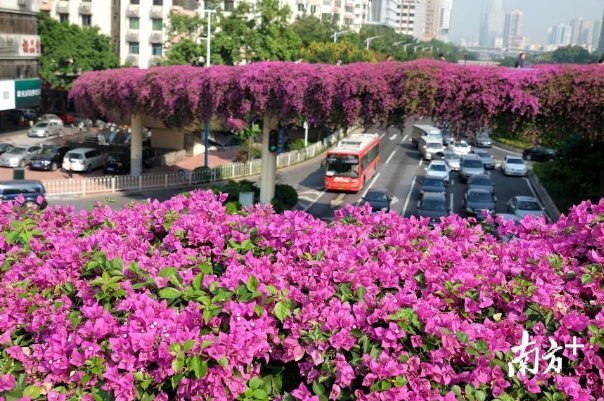 11月的北方早已寒风萧瑟,树木凋零;广州却是另一番光景:蓝天白云下,蜿蜒于高楼间的高架桥上的簕杜鹃争相绽放,紫色、红色、黄色等颜色搭配的花道,仿佛给高架桥描上了漂亮的花边。