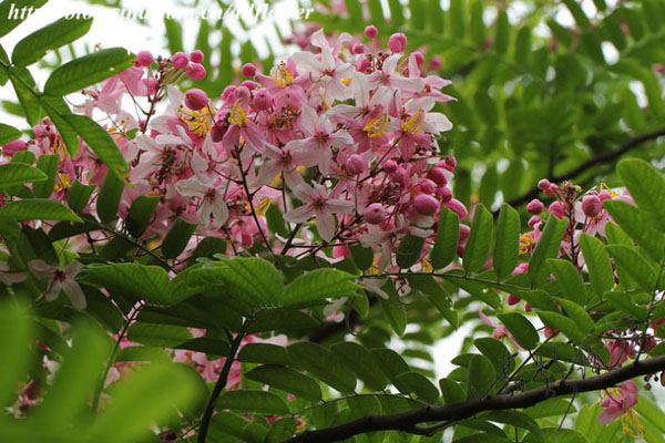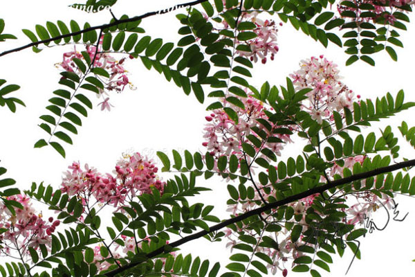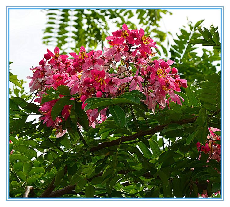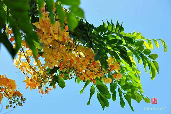 又名彩虹旃(zhān)那,为爪哇决明与腊肠树的杂交种。落叶小乔木,树干及枝条下垂状,具针刺。花开红、黄、白三色,花团锦簇,风采迷人,花姿娇艳非凡,适合庭园观花树种或做行道树。