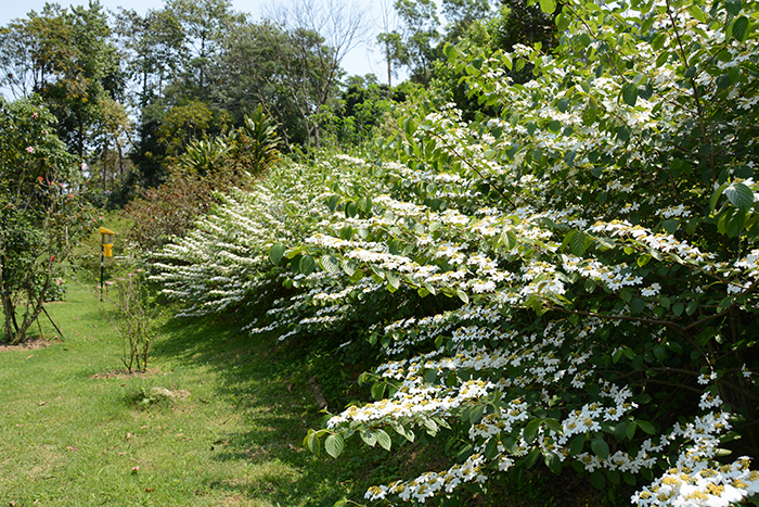 又名蝴蝶树、假沙梨,忍冬科荚蒾属落叶性灌木至小乔木,最高可达2米。枝叶被黄褐色或锈色星状毛。叶纸质,近圆形或椭圆形,边缘除基部外有锯齿。聚伞花序伞房状,花稀疏,形似蝴蝶。花期4-5月。蝶花荚蒾花形优美,花色洁白,喜温暖湿润、半阴的环境,抗寒性较强,分布于江西、福建、湖南、广东及广西等地,是良好的园林观花植物。
