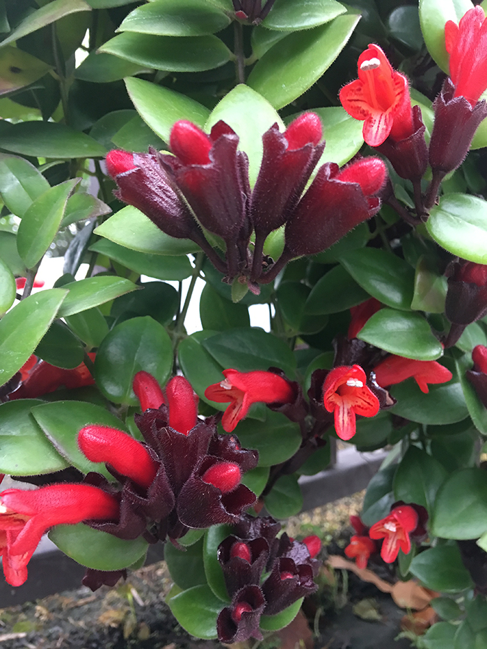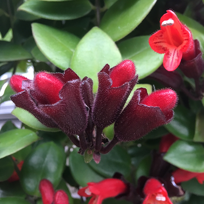 苦苣苔科芒毛苣苔属多年生常绿藤本,茎长可达1米,叶对生、叶片革质;花型独特、花色艳丽,适于盆栽悬挂,为观叶、观花的优良品种。口红花原产印尼、马来西亚、爪哇一带,我国引种栽培,喜明亮光照的半阴环境,生长适温为21-26℃,较耐寒,在室温适宜的情况下,口红花可在12月至来年3月间开花。