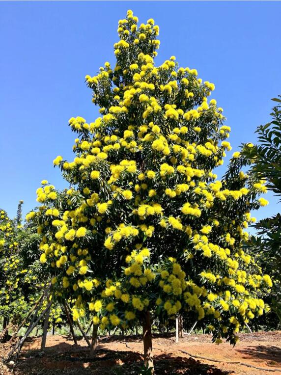 又名金蒲桃,别名澳洲黄花树,原产澳洲,桃金娘科常绿观花小乔木。其花期长、花量大,鲜艳夺目,鲜黄色的小花聚生在枝条的顶端,排成伞房花序,远看仿佛一个个憨态可掬的熊猫脸。盛花期11月—12月。金黄熊猫性喜光照充足的温湿环境,对栽培土质选择不严,耐瘠薄,病虫害少,是一种十分优良的园林绿化树种。
