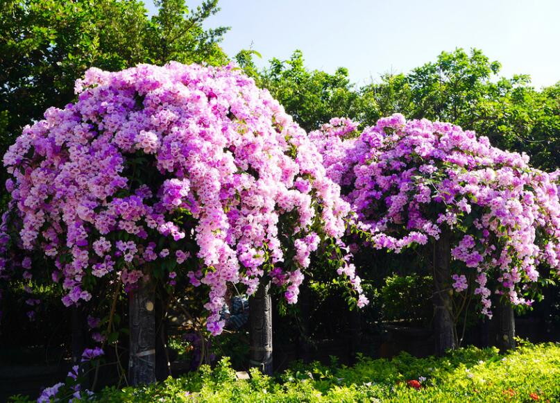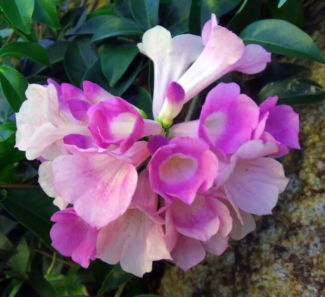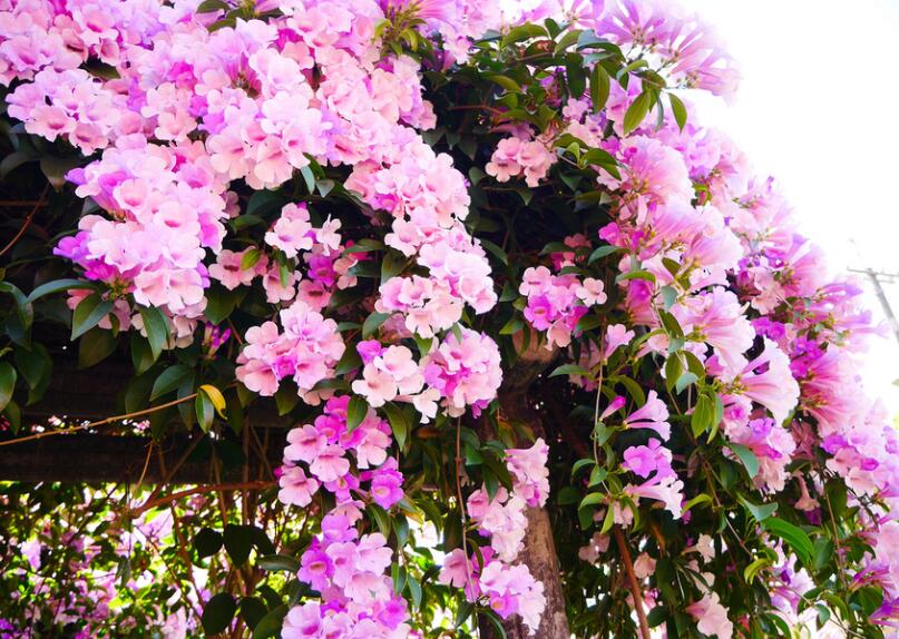 别称:紫铃藤、张氏紫葳,紫葳科蒜香藤属常绿攀缘灌木,植株蔓性,具卷须,叶为二出复叶,深绿色椭圆形,具光泽。花腋生,聚伞花序,花冠筒状,开口五裂。花期春季至秋季,盛花期8-12月。其花、叶在搓揉之后,有大蒜的气味,因此得名蒜香藤。蒜香藤盛开时,碧绿的叶丛间大朵大朵的紫、白色花朵成团簇生,如瀑布般串生在柔软下垂的枝条上,仿佛垂挂着的串串彩球,绚丽烂漫,令人心醉。园林用途适合花廊、花架、篱墙或荫棚美化。