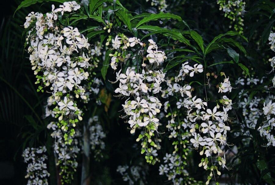 又名垂枝茉莉、黑叶龙吐珠,马鞭草科常绿灌木。其条纤细,花白芳香、花序下垂,花姿飘逸,花期10月至次年4月,果期春夏之际。果实球形,初时黄绿色,成熟后光亮紫黑色、倒挂,故有“黑叶龙吐珠”之称。适合庭院种植或大型盆栽,喜温暖湿润的环境,在我国云南、两广等地均有分布。