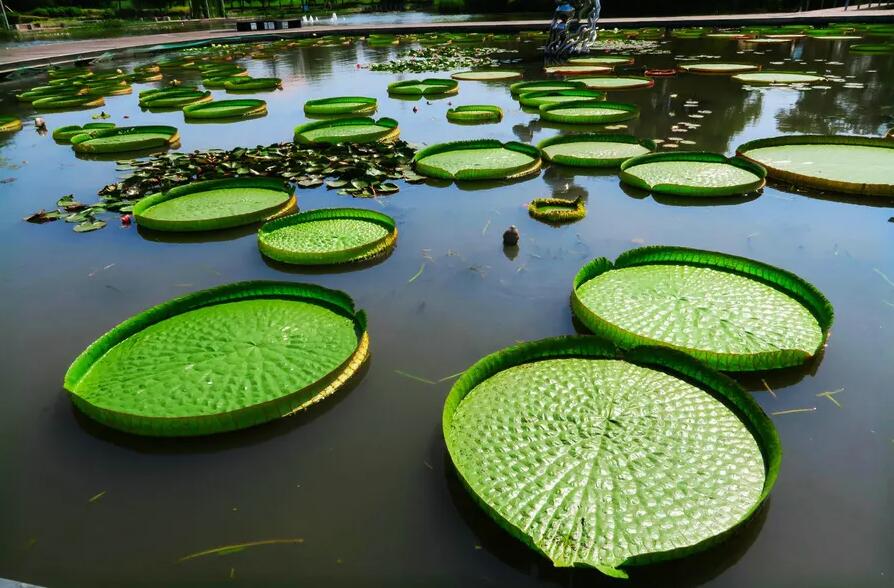 睡莲科王莲属多年生大型浮叶草本,初生叶呈针状,2-3片叶呈矛状,4-5片叶呈戟形,6-10片叶呈椭圆形至圆形,11片叶后叶缘上翘呈盘状,叶缘直立,叶片圆形,像圆盘浮在水面,叶面绿色、光滑,有皱褶,背面紫红色,叶子背面和叶柄有许多坚硬的刺;花很大,单生,从白色逐渐变为淡红色至深红色;花果期7月-9月。