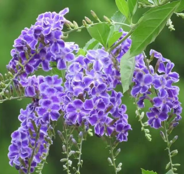 又名蕾丝金露花、假连翘、蓝精灵,马鞭草科金露花属常绿灌木,喜阳光充足温暖的环境,生性强健,生长快,耐旱。春至秋季开花。总状花序腋出顶生,花冠蓝紫或白色,核果球形。成熟后橙黄色。聚生成串,内含种子4~8粒,果实有毒。