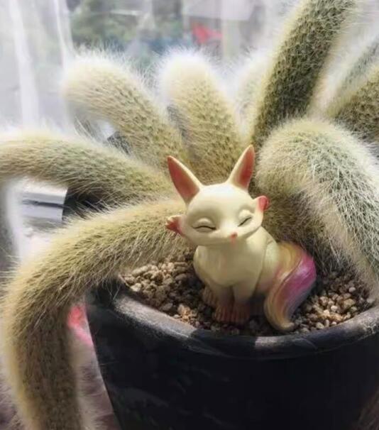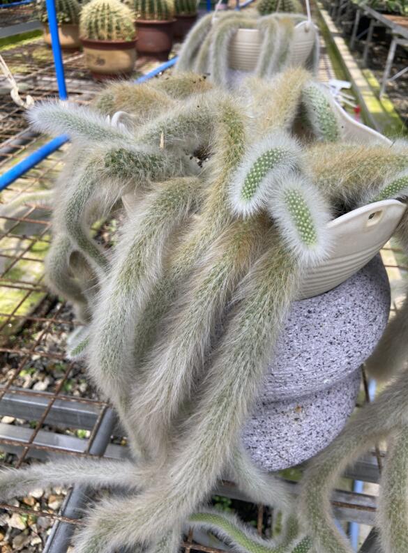 仙人掌科管花柱属多肉植物,原产玻利维亚,其肉质茎非常柔软,直径约2厘米左右,长度可达1.5米左右,幼苗期直立生长,成株以后开始进入悬垂生长,柱体密被白色长毛,因形似猴尾,故而得名猴尾柱,而分枝长到9条以上的时候大家又将其称为九尾狐或九尾妖狐。