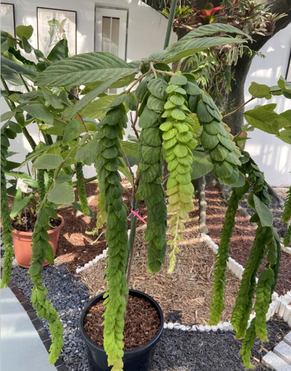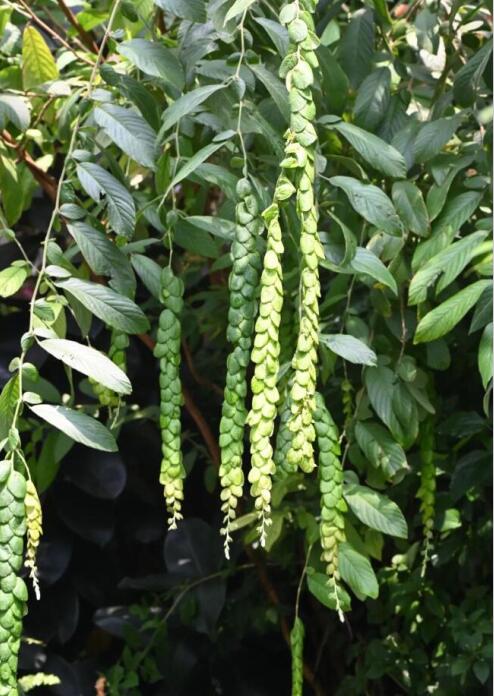 豆科排钱树属灌木,别名摇钱树。高0.5~2米,小枝“之”字形弯曲,枝条上长有白或灰色的短柔毛。排钱树如同其名,其叶状苞片紧密相接,整齐排列,生于枝端,既像龙鳞,又像古代的铜钱。在花果期时,枝端如同挂满了一串串“铜钱”,随风摇曳,苞片早晨自然舒张,晚间闭合,奇特有趣。