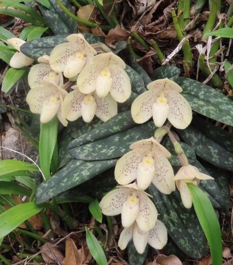兰科,兜兰属。地生或半附生植物。具稍肉质的根状茎。茎短,叶基生,对折,4或5枚,叶面分布暗白色斑点,叶背紫色。花葶近直立,有花1~3朵;花梗有紫褐色斑点,被短柔毛。花白色和黄色,正面被毛,具红褐色斑点;唇瓣倒球形,外被白色微柔毛;花期5月。文山兜兰产于我国云南东南部,生于浓密的灌木和草坡石灰岩地区;性喜温暖,不耐极低温,栽培时需保持湿润、排水良好的培养土。花形奇特、花色雅致、整朵具不规则斑点,属观赏类花草。文山兜兰是国家一级保护野生植物,2025年8月首次野外回归。