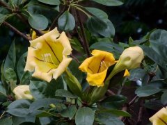 别名金杯藤,茄科常绿藤状灌木。花大而香,花冠杯状、金黄色,有牛皮的质地。初花时含苞待放,散发阵阵浓郁的奶油蛋糕般甜蜜的香味。盛花时张开为喇叭状的花朵,像金色的奖杯...
