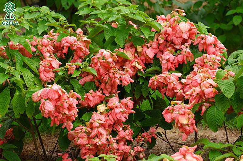 【形态特征】半落叶灌木,高1~2m。聚伞花序顶生;花萼的5枚裂片均扩大成粉红色花瓣状;花冠金黄色,喉部红色。优良木本花卉,盛花期满树粉红色花朵鲜艳夺目,金黄色小花小巧夺目。花期:6~10月。