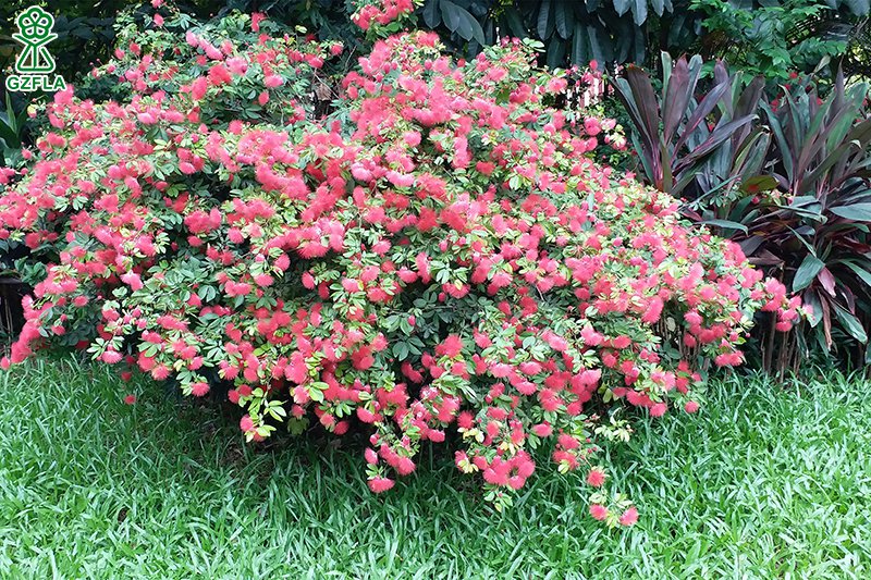【形态特征】半常绿灌木,高达3 m。头状花序腋生,有花20余朵,雄蕊红色,花丝细长,聚合成半球状,如化妆用的粉扑。花期:5~10月;果期:10~11月。