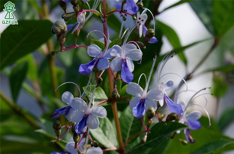 【形态特征】常绿灌木,高0.5~1.5 m。圆锥花序顶生,花白色,花瓣平展花冠两侧对称,唇瓣紫蓝色;杯形花萼5裂,略带紫色;雄蕊细长,伸出花冠外。花期:早春至夏季。